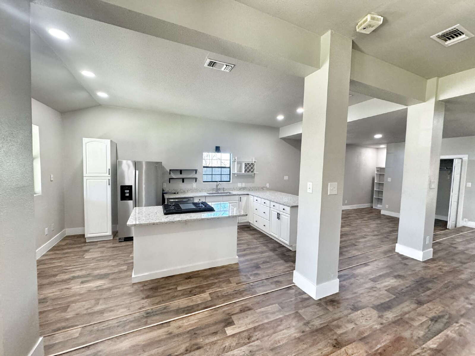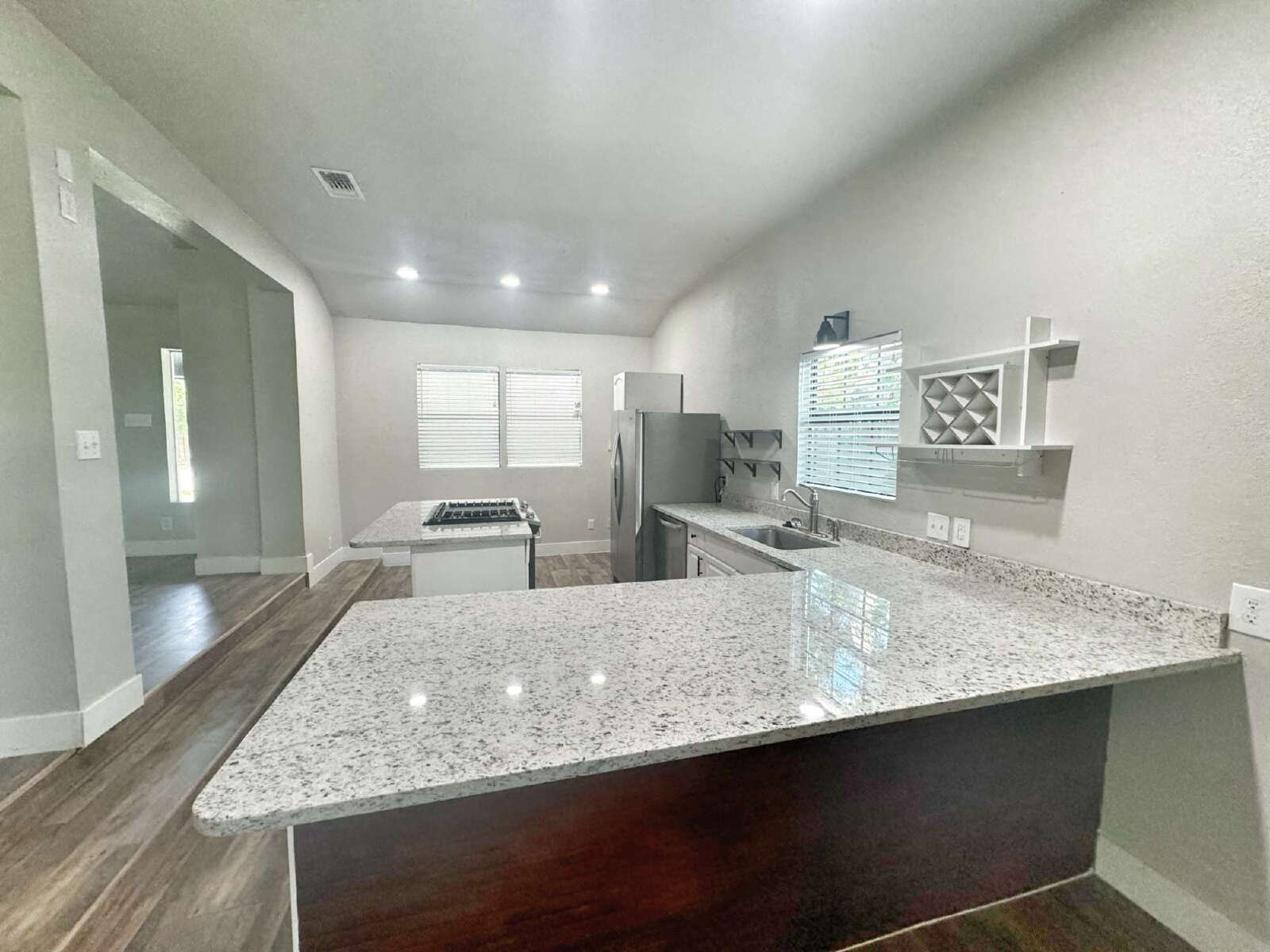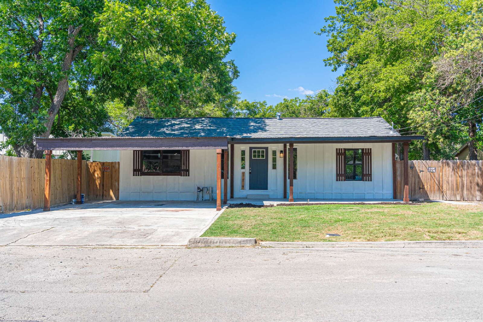 LOCATION, LOCATION, LOCATION! This charming, fully remodeled single-story home offers 2 bedrooms and 2 bathrooms, combining modern comfort with unbeatable convenience—just minutes from downtown New Braunfels. Perfectly situated near HEB, shopping, dining, and all the attractions downtown has to offer, this home boasts an open floor plan flooded with natural light, creating a bright and airy atmosphere. The spacious living room serves as the focal point, complete with an electric fireplace that adds both warmth and charm. The updated kitchen and dining area feature granite countertops, a gas cooktop, stainless steel appliances, a convenient breakfast bar, and ample cabinet space. A discreet laundry closet is thoughtfully tucked away for added convenience. The primary suite is a true retreat, highlighted by bay windows overlooking the expansive backyard. It offers a large walk-in closet and a beautifully updated bathroom with dual vanities and a floor-to-ceiling tiled walk-in shower. The second bathroom is equally stylish, featuring a pedestal sink and a tub/shower combo. Step outside to enjoy the large covered deck, fenced backyard, and storage shed—the perfect setup for entertaining, relaxing, or simply enjoying outdoor living. This home truly embodies the perfect blend of modern updates and prime location, offering a lifestyle of convenience and comfort in the heart of New Braunfels.