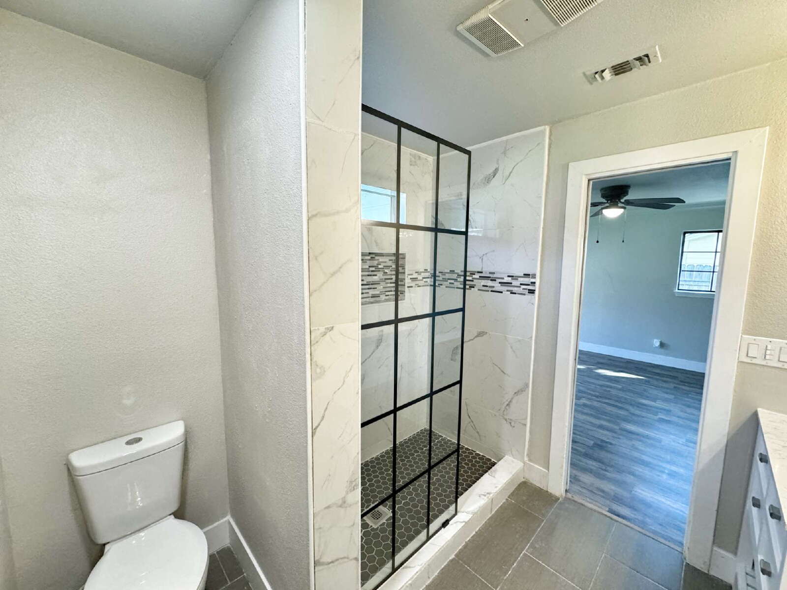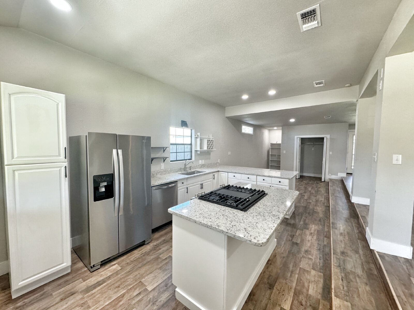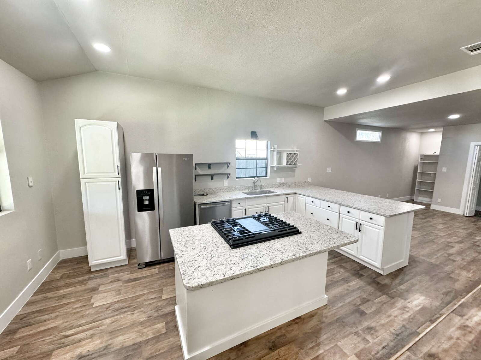 LOCATION, LOCATION, LOCATION! This charming, fully remodeled single-story home offers 2 bedrooms and 2 bathrooms, combining modern comfort with unbeatable convenience—just minutes from downtown New Braunfels. Perfectly situated near HEB, shopping, dining, and all the attractions downtown has to offer, this home boasts an open floor plan flooded with natural light, creating a bright and airy atmosphere. The spacious living room serves as the focal point, complete with an electric fireplace that adds both warmth and charm. The updated kitchen and dining area feature granite countertops, a gas cooktop, stainless steel appliances, a convenient breakfast bar, and ample cabinet space. A discreet laundry closet is thoughtfully tucked away for added convenience. The primary suite is a true retreat, highlighted by bay windows overlooking the expansive backyard. It offers a large walk-in closet and a beautifully updated bathroom with dual vanities and a floor-to-ceiling tiled walk-in shower. The second bathroom is equally stylish, featuring a pedestal sink and a tub/shower combo. Step outside to enjoy the large covered deck, fenced backyard, and storage shed—the perfect setup for entertaining, relaxing, or simply enjoying outdoor living. This home truly embodies the perfect blend of modern updates and prime location, offering a lifestyle of convenience and comfort in the heart of New Braunfels.