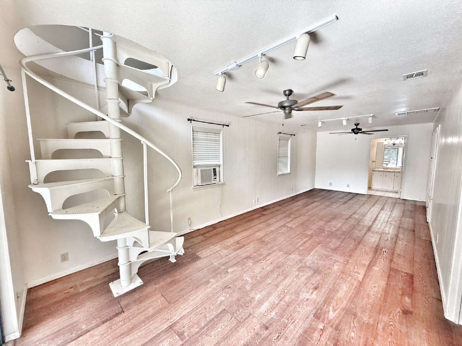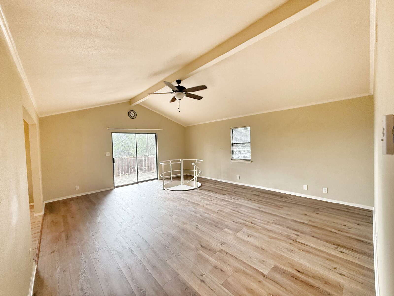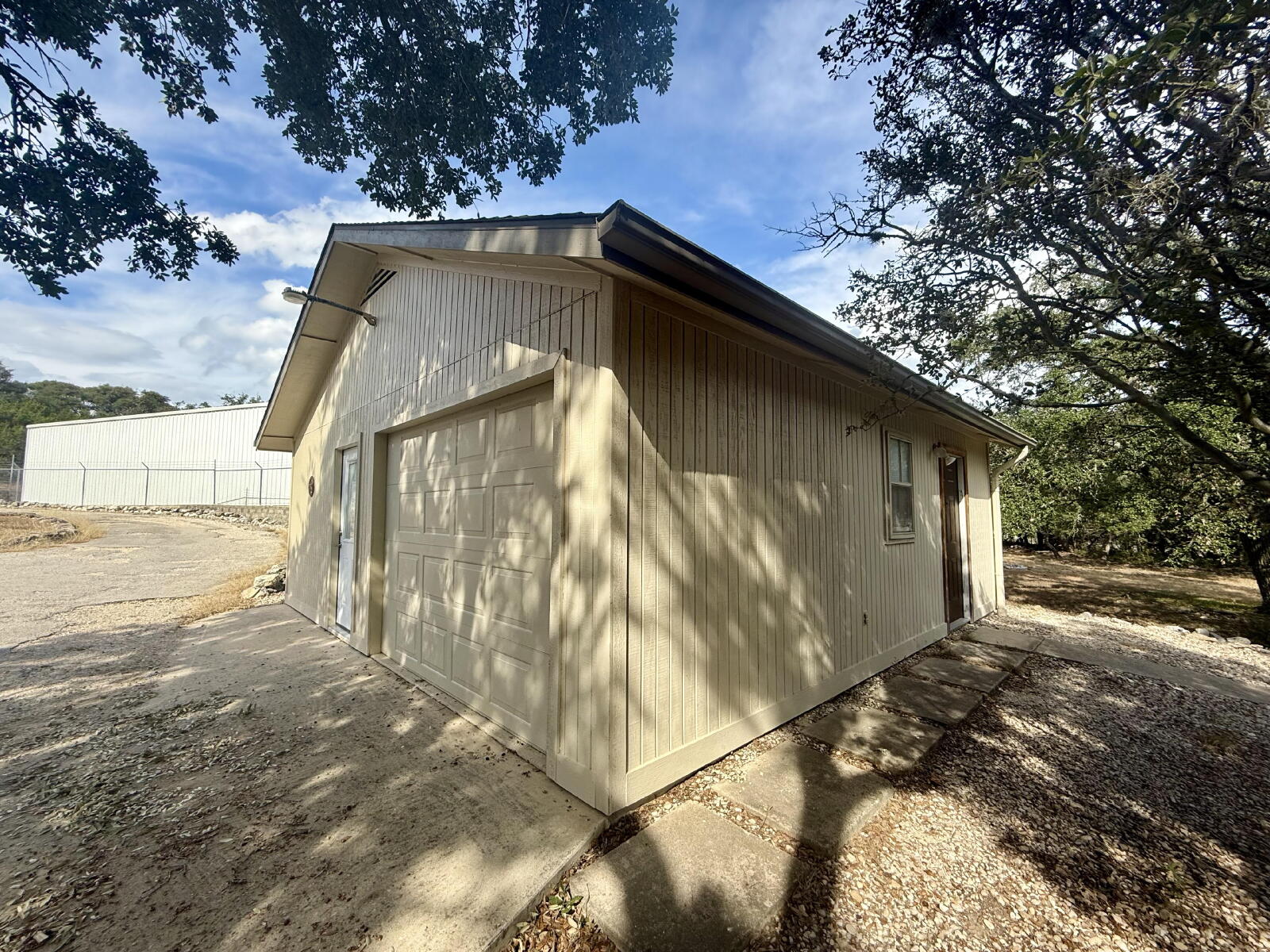 Inside the main home, the first floor welcomes you with a large game room, a generous bedroom with porch access, a full bath with a walk-in shower and single vanity, and a utility room for added convenience. Upstairs, the open-concept living area offers an inviting eat-in kitchen with ample cabinetry, a built-in oven, microwave, cooktop, refrigerator, and charming tile countertops. The cozy living room opens to a wrap-around deck—ideal for enjoying your morning coffee while taking in the scenic Hill Country views and local wildlife. Two additional bedrooms share a full bathroom with a walk-in shower and single vanity.